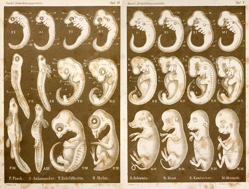 Como exemplo, Haeckel apontou semelhanças entre embriões humanos e de peixes nas fases iniciais, ambos apresentando fendas branquiais e caudas rudimentares, características que ele associava a estágios ancestrais comuns.